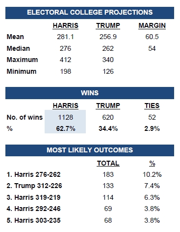 The model ran 1,800 daily simulations of the presidential race between Republican Donald Trump and Democrat Kamala Harris. By introducing random variability to account for uncertainty, I was able to estimate the odds of each candidate winning and the most likely electoral vote distributions.
