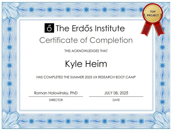 In summer 2025, I completed the Erdős Institute UX Research Bootcamp, a hands-on program teaching participants how to apply quantitative and qualitative research to real-world product and business challenges. The capstone was a team-based project simulating UX and market research scenarios for three fictional clients: